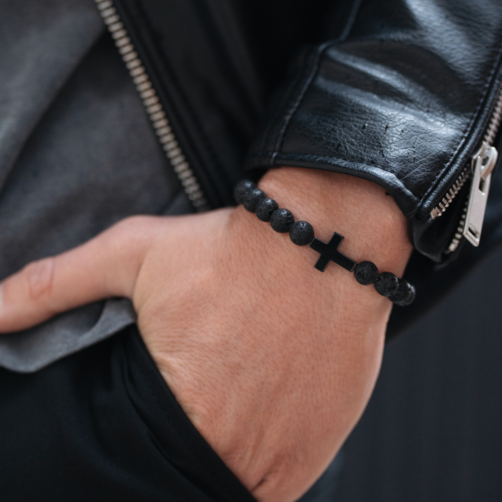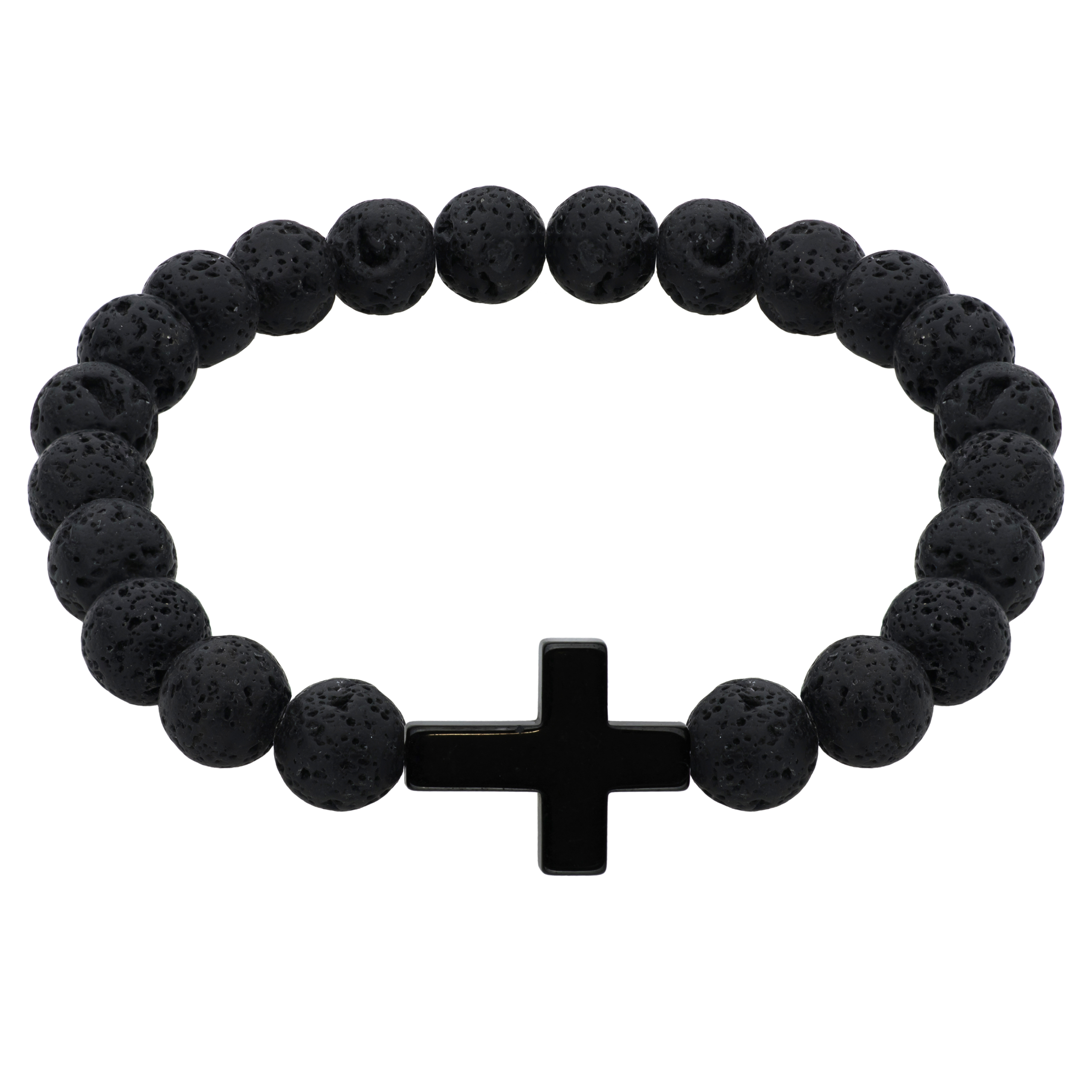 Bransoletka wykonana z matowych kamieni lawy wulkanicznej to propozycja dla mężczyzn, którzy cenią prostotę i wyrazisty design. Jej surowa faktura i głęboka, naturalna czerń nadają całości charakterystyczny, męski wygląd. Centralnym punktem kompozycji jest hematytowy krzyż o subtelnym, metalicznym połysku, który kontrastuje z porowatą powierzchnią kamieni.