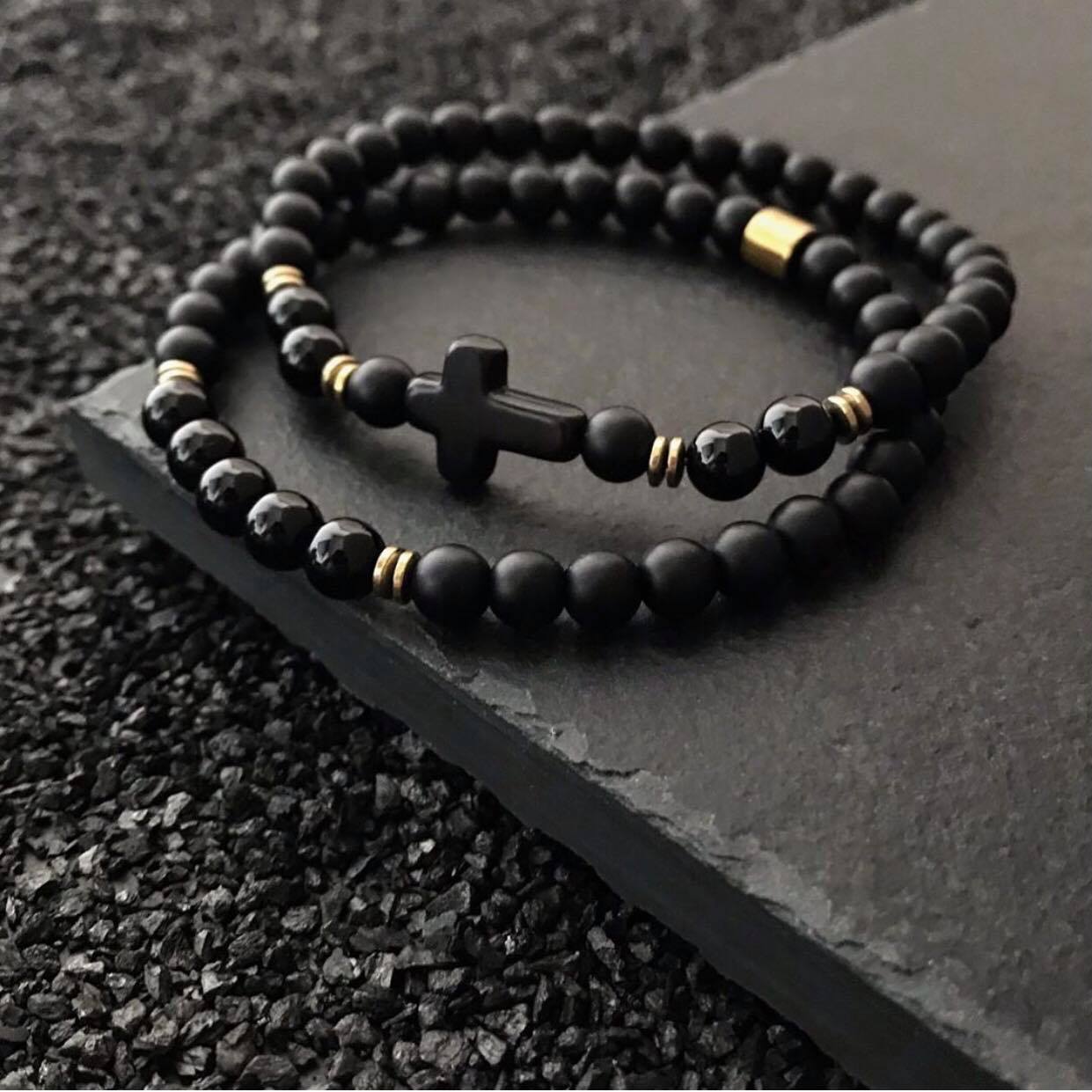 Zestaw składa się z dwóch oddzielnych bransoletek wykonanych z matowych koralików black stone i onyksu w głębokim, czarnym odcieniu. Każda z nich została uzupełniona złotymi akcentami z hematytu oraz detalem w formie krzyża, co nadaje całości eleganckiego, a jednocześnie nowoczesnego charakteru. Bransoletki można nosić razem jako spójny komplet lub oddzielnie – w zależności od stylizacji i okazji.