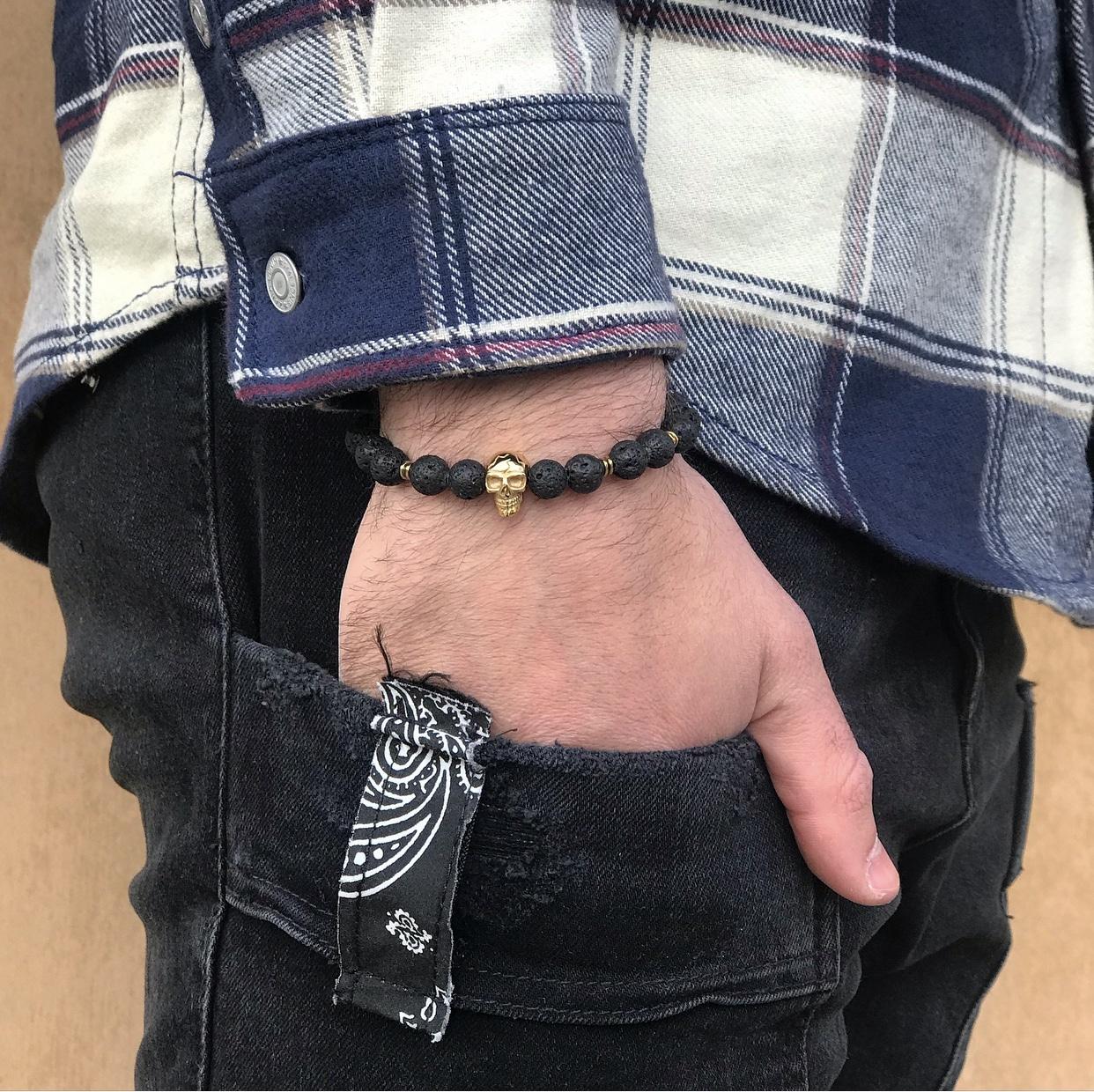 Czaszka od dawna jest symbolem odwagi, siły i przemijania. W naszej bransolecie męskiej ta symbolika łączy się z mocą kamieni naturalnych, zwłaszcza z lawy wulkanicznej, której właściwości są znane od wieków. Kamienie te symbolizują siłę wewnętrzną i determinację, a jednocześnie przypominają o naturze i ulotności życia.