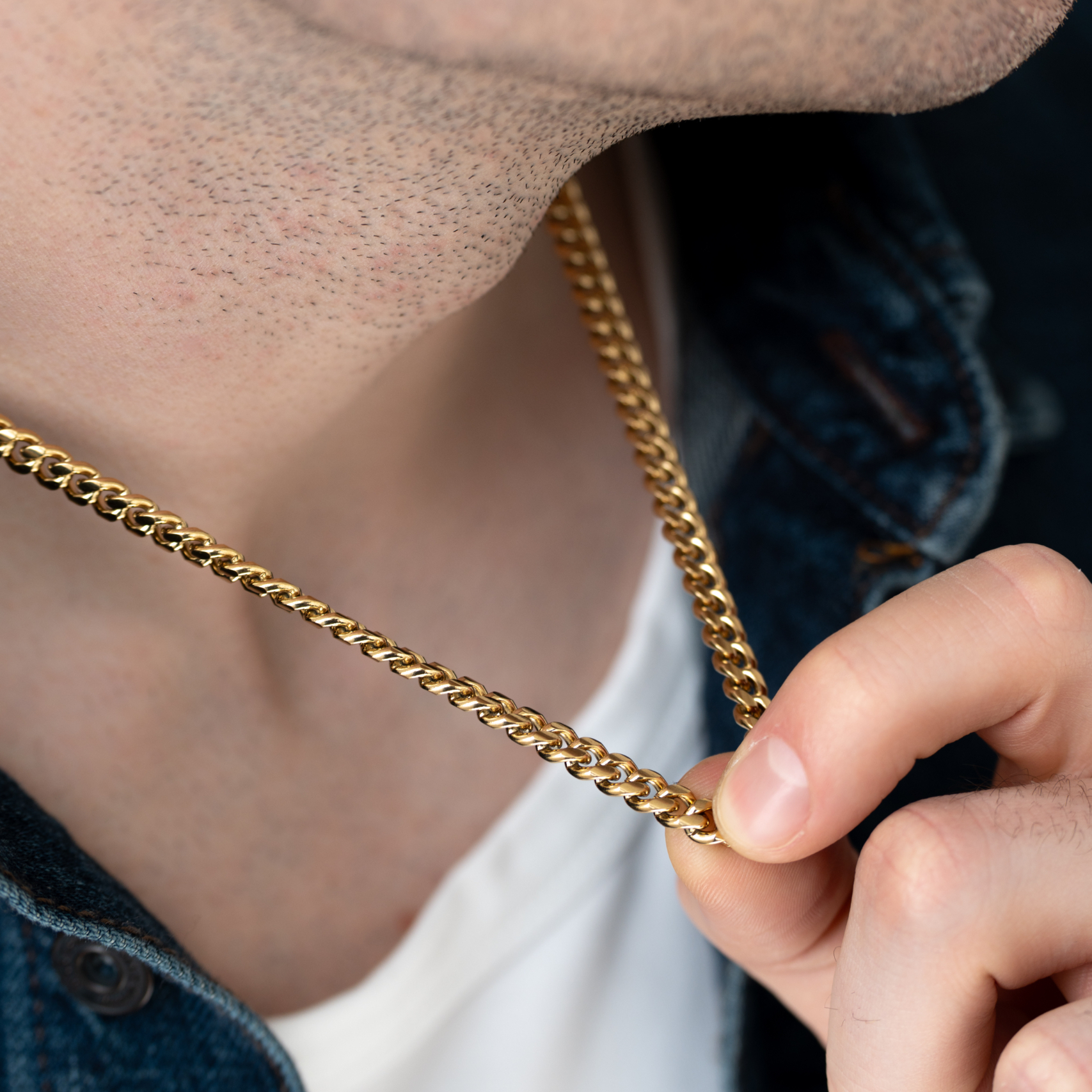 Elegancki naszyjnik męski łańcuch złoty o splocie pancerki stanowi kwintesencję męskiego stylu i solidności. Wykonany jest ze stali nierdzewnej 316L, która jest nie tylko trwała, ale także wyjątkowo estetyczna. Ten naszyjnik będzie stanowił dopełnienie każdego męskiego stroju, podkreślał charakter i indywidualność noszącego (zobacz inne propozycje).
